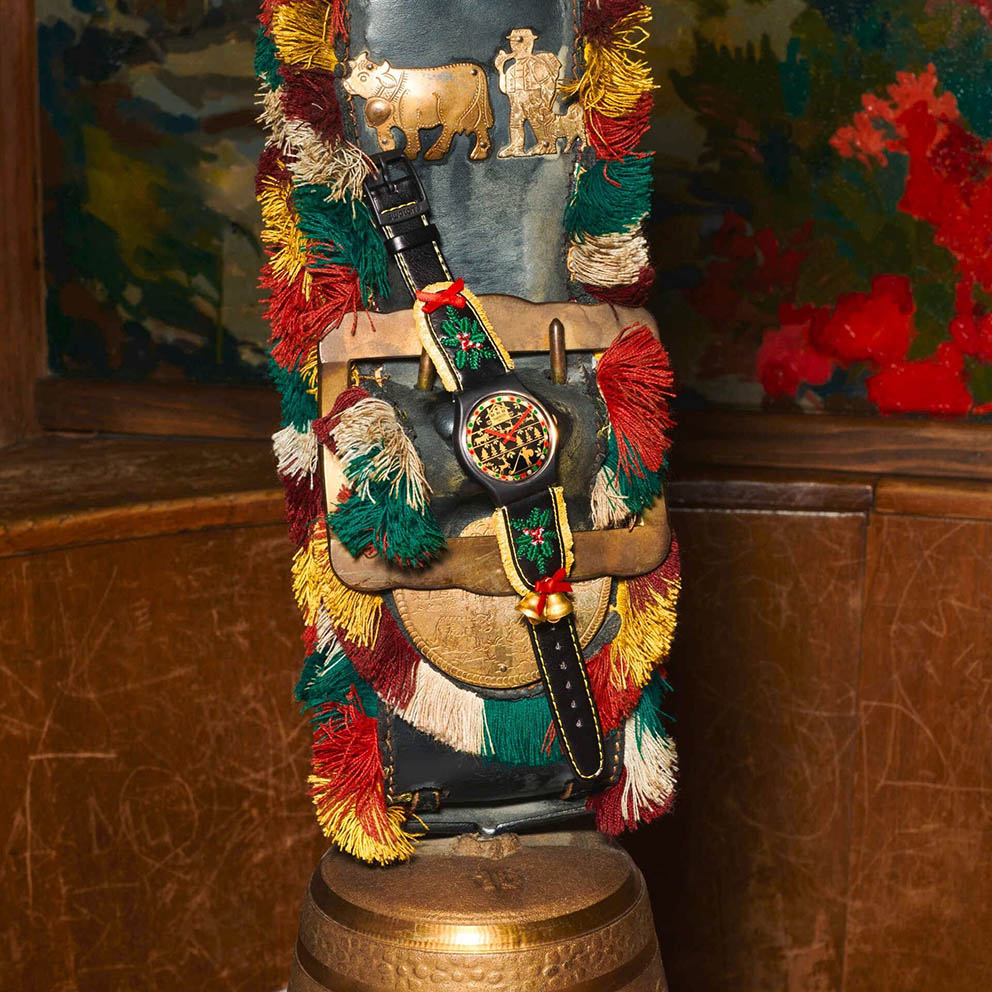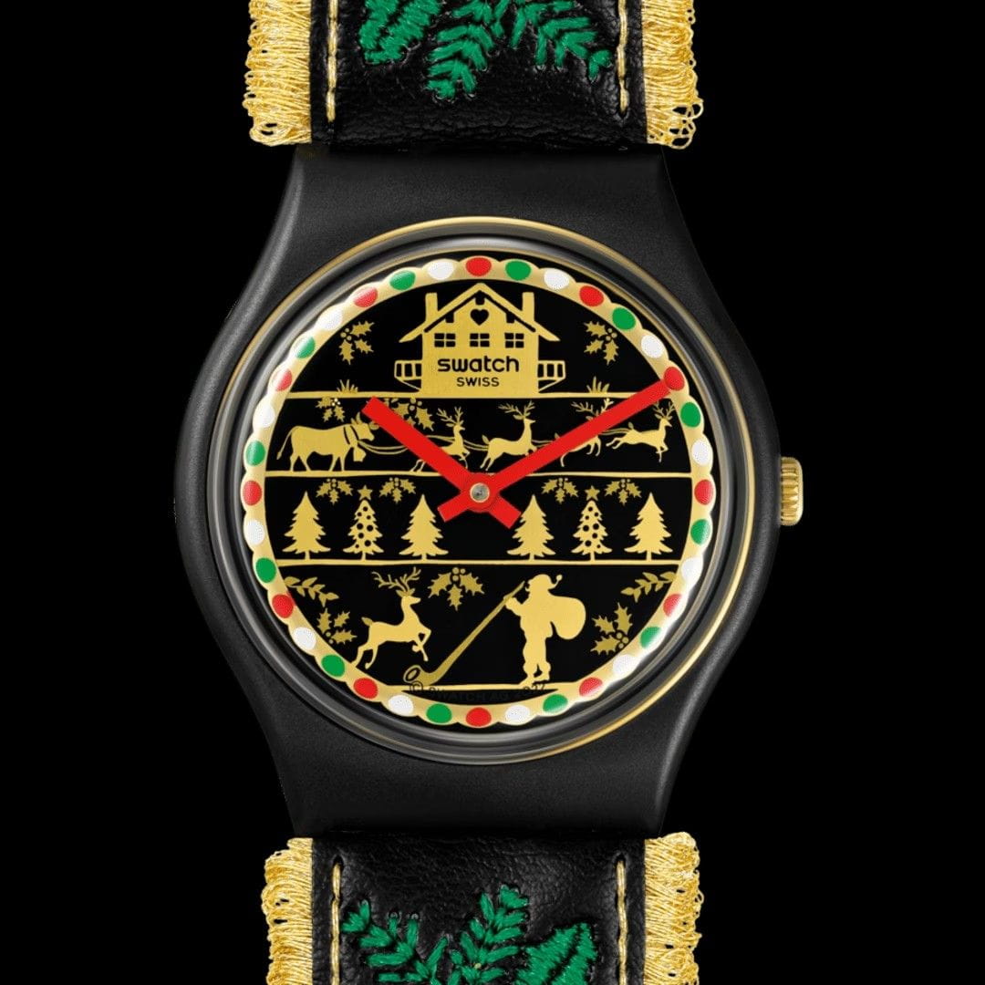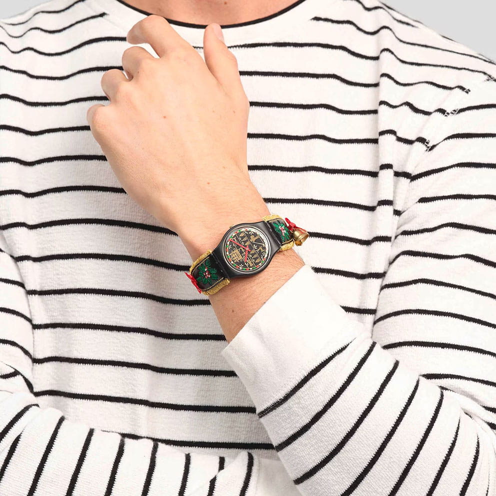 Часы SWATCH SO28B115 — это оригинальный зимний новогодний аксессуар. Центральным элементом дизайна является циферблат, украшенный черной-золотой печатью и красными стрелками, создающими контраст и подчеркивающими новогоднее настроение. Корпус часов имеет диаметр 34 мм и выполнен из биоматериала. Ремешок кожаный, украшен декоративным узором в виде колокольчиков, что делает аксессуар ещё более подходящим для зимних праздников. Часы оснащены кварцевым механизмом, обеспечивающим точность хода, и водонепроницаемостью до 30 метров, что позволяет использовать их в повседневной жизни. Эта модель станет идеальным выбором для тех, кто хочет выделиться и подчеркнуть свою индивидуальность.
