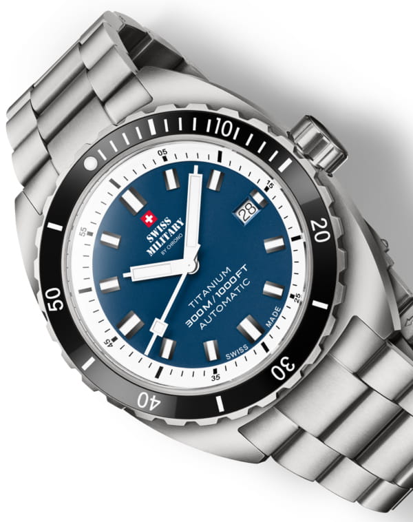 Мужские швейцарские механические часы с автоподзаводом Swiss Military by Chrono Titanium 300 SMA34100.03. Сапфировое стеклоСапфировое стеклоПрочный и надёжный материал из кристалла сапфира синтетического происхождения, характеризующийся особой твёрдостью и устойчивостью к царапинам и повреждениям. устойчивое к появлению царапин, обладающее высокой прозрачностью. Корпус часов изготовлен из титана. Вращающийся безельБезельВнешний ободок, закрепляющий стекло. В спортивных часах так называется поворотное кольцо с делениями на циферблате, выполняет роль таймера – замеряет отрезки времени на шкале. Неподвижный безель – элемент декора. Однонаправленно вращающийся безель на дайверских часах позволяет фиксировать моменты погружения и выныривания на поверхность. из высокотехнологичной керамикиВысокотехнологичная керамикаИнновационный запатентованный Rado материал с гладкой или матовой поверхностью. Керамика за счёт кристаллической структуры обладает повышенной устойчивостью от возникновения царапин. Материал способен принимать температуру тела человека, обеспечивая невероятный комфорт при ношении.. Индикация даты на позиции трех часов. Стрелки и метки с люминесцентной подсветкойЛюминесцентное покрытиеПозволяет считывать показания времени в темноте. Производители наносят на стрелки, часовые индексы, безель или поверхность циферблата светонакопительный состав, дающий холодное свечение.. Класс водозащиты: 300 метров, позволит плавать, нырять и заниматься другими водными видами спорта. Титановый браслет на раскладной застёжкеРаскладная застёжкаТакой тип застёжки используется только на браслетах из металла. Она никогда не раскрывается полностью, происходит разделение на 2 и более частей. Раскладывающая застёжка снизит вероятность потери часов к минимуму..
