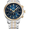 Синий циферблат с классическими индексами и стрелками дополнен люминесцентным покрытиемЛюминесцентное покрытиеПозволяет считывать показания времени в темноте. Производители наносят на стрелки, часовые индексы, безель или поверхность циферблата светонакопительный состав, дающий холодное свечение. для удобства использования в условиях низкой освещённости. Модель оснащена функцией хронографа, позволяющим измерять секунды, минуты и 1/10 секунды. Окошко даты, расположенное между 4 и 5 часами, добавляет практичности. БезельБезельВнешний ободок, закрепляющий стекло. В спортивных часах так называется поворотное кольцо с делениями на циферблате, выполняет роль таймера – замеряет отрезки времени на шкале. Неподвижный безель – элемент декора. Однонаправленно вращающийся безель на дайверских часах позволяет фиксировать моменты погружения и выныривания на поверхность. с PVD-покрытиемPVDУльтратонкое покрытие наносится в технике вакуумного напыления, сочетает в себе нитрид титана особой прочности со слоем золота или оксида хрома. Несёт в себе декоративную или защитную функцию..