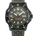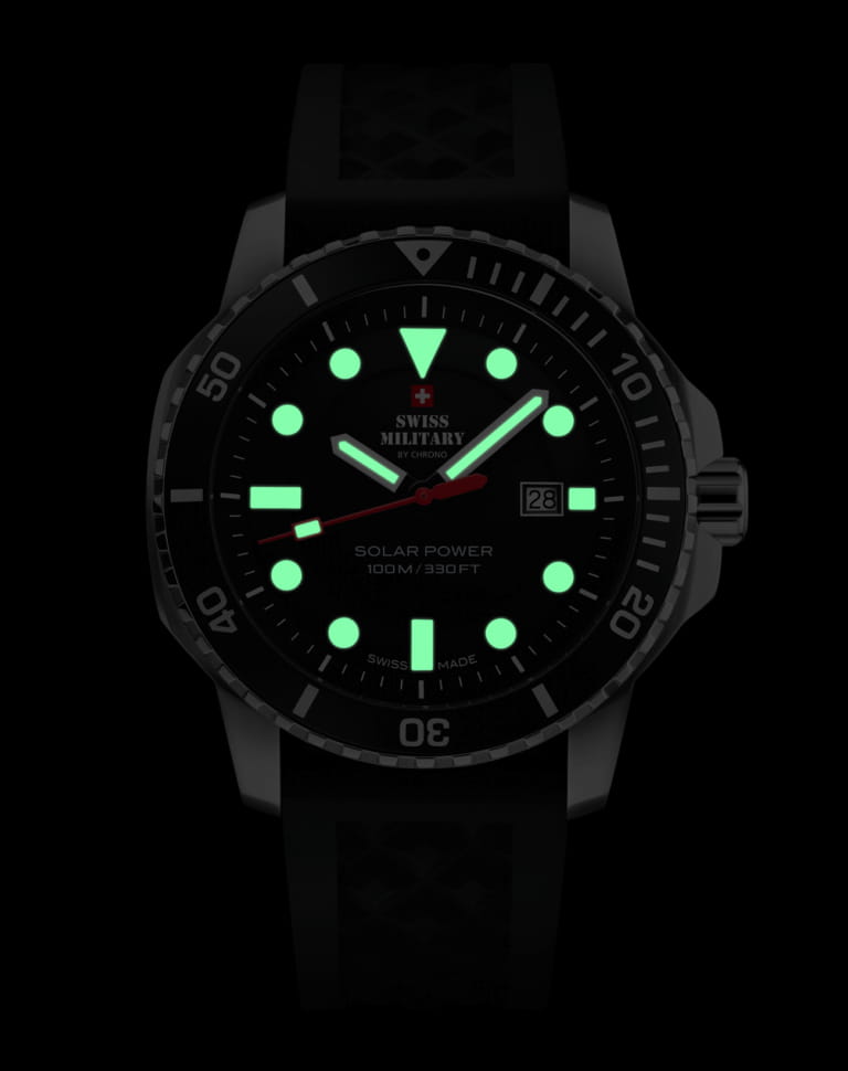 Мужские кварцевые часы Swiss Military — это прочный и функциональный аксессуар. Корпус диаметром 43 мм и толщиной 11 мм выполнен из нержавеющей стали с PVD-покрытиемPVDУльтратонкое покрытие наносится в технике вакуумного напыления, сочетает в себе нитрид титана особой прочности со слоем золота или оксида хрома. Несёт в себе декоративную или защитную функцию. цвета чёрного золота. Циферблат зелёного цвета оформлен индексами, стрелками и апертурой даты в положении 3 часов. Стрелки и метки с люминесцентным покрытиемЛюминесцентное покрытиеПозволяет считывать показания времени в темноте. Производители наносят на стрелки, часовые индексы, безель или поверхность циферблата светонакопительный состав, дающий холодное свечение., обеспечивающим хорошую читаемость в темноте. Циферблат защищён сапфировым стекломСапфировое стеклоПрочный и надёжный материал из кристалла сапфира синтетического происхождения, характеризующийся особой твёрдостью и устойчивостью к царапинам и повреждениям.. Механизм — швейцарское кварцевое движение калибра Ronda 215 (Swiss Made) на солнечной батарее. БезельБезельВнешний ободок, закрепляющий стекло. В спортивных часах так называется поворотное кольцо с делениями на циферблате, выполняет роль таймера – замеряет отрезки времени на шкале. Неподвижный безель – элемент декора. Однонаправленно вращающийся безель на дайверских часах позволяет фиксировать моменты погружения и выныривания на поверхность. вращающийся. Заводная головка с защитой повышает надёжность. Часы оснащены зелёным резиновым ремешком на классической пряжке. Водонепроницаемость 100 м позволяет использовать часы для плавания и повседневного ношения. Идеальный выбор для тех, кто ценит швейцарское качество и универсальный дизайн.