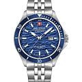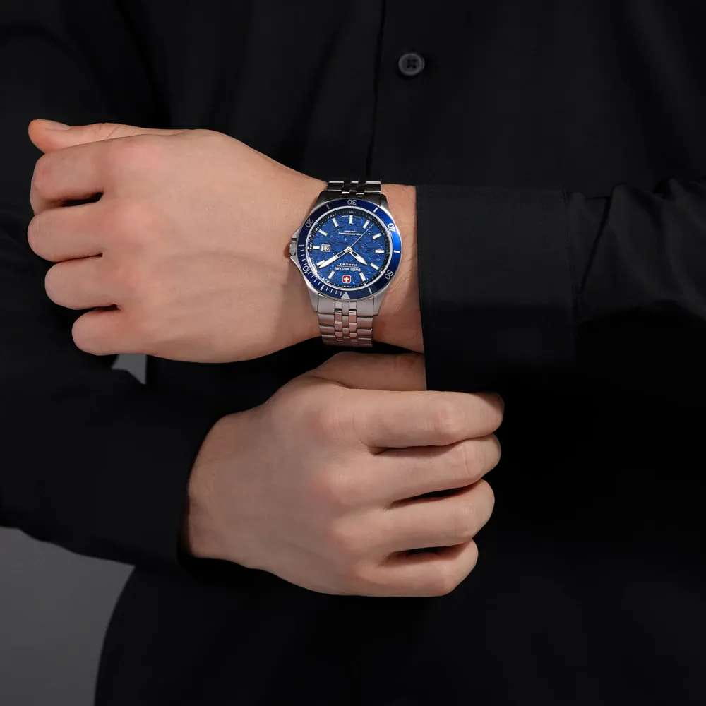 Мужские кварцевые часы Swiss Military Hanowa — швейцарская надёжность в классическом исполнении. Корпус круглый, из нержавеющей стали, диаметром 42 мм. Циферблат — синий с серебристыми стрелками. Стекло — сапфировоеСапфировое стеклоПрочный и надёжный материал из кристалла сапфира синтетического происхождения, характеризующийся особой твёрдостью и устойчивостью к царапинам и повреждениям.. Механизм — швейцарский кварцевый Ronda 505 с функцией **hack** (остановка секундной стрелки для точной настройки). БезельБезельВнешний ободок, закрепляющий стекло. В спортивных часах так называется поворотное кольцо с делениями на циферблате, выполняет роль таймера – замеряет отрезки времени на шкале. Неподвижный безель – элемент декора. Однонаправленно вращающийся безель на дайверских часах позволяет фиксировать моменты погружения и выныривания на поверхность. — неподвижный, из нержавеющей стали с IP-покрытиемIP-покрытиеМетод ионного напыления. Демонстрирует повышенную устойчивость к истиранию, окислению и химическим веществам. Под воздействием высокого давления и температуры около 1500°C молекулы металла надёжно соединяются с частицами корпуса часов.. Задняя крышка — завинчивающаяся. Водонепроницаемость 100 м. Браслет — стальной, на раскладной застёжке с кнопками и фиксаторомРаскладная застёжкаТакой тип застёжки используется только на браслетах из металла. Она никогда не раскрывается полностью, происходит разделение на 2 и более частей. Раскладывающая застёжка снизит вероятность потери часов к минимуму.. Идеальный выбор для тех, кто ценит швейцарское качество и классический стиль.