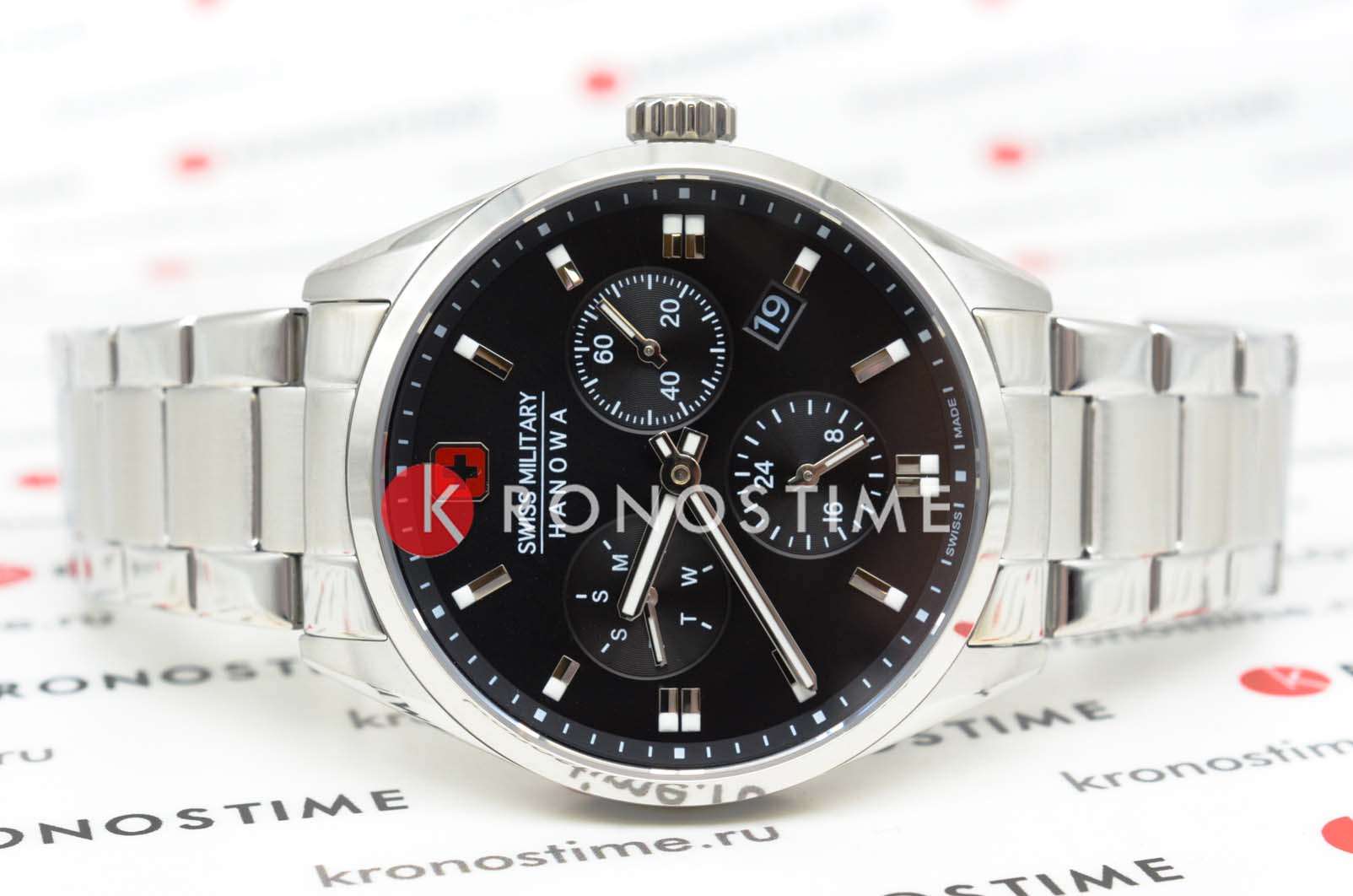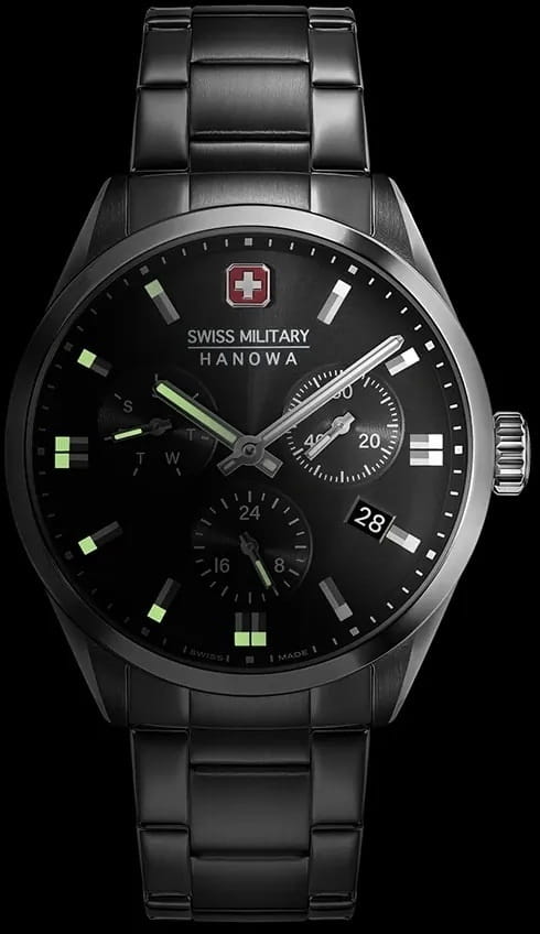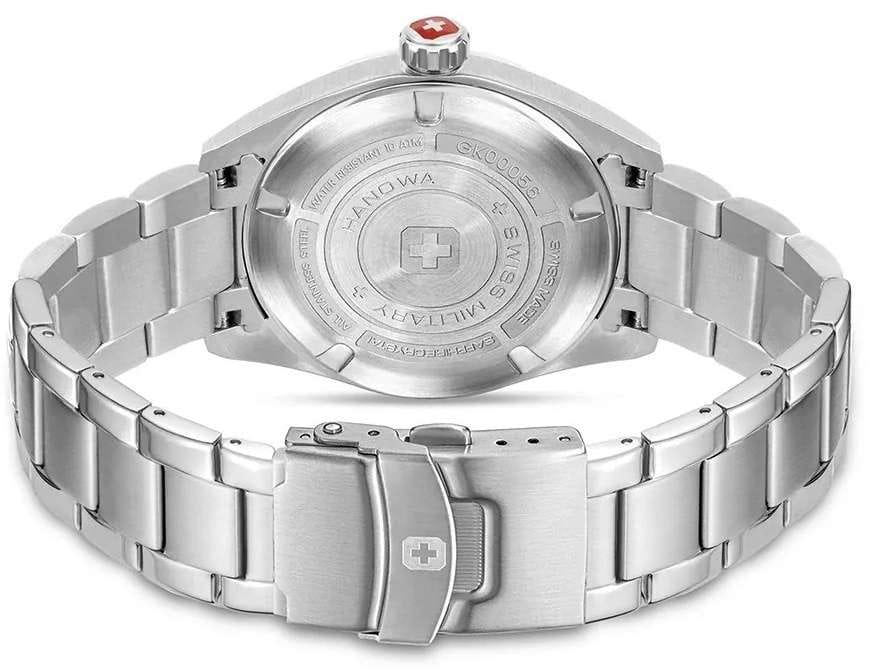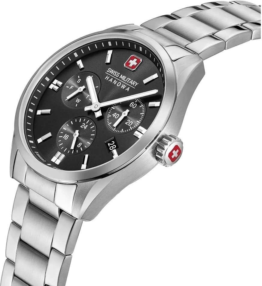 Мужские швейцарские часы Swiss Military Hanowa SMWGK0005601 – это элегантные часы, сочетающие в себе классический дизайн и современную функциональность. Корпус из нержавеющей стали диаметром 43 мм сбалансирован и элегантен. Сапфировое стеклоСапфировое стеклоПрочный и надёжный материал из кристалла сапфира синтетического происхождения, характеризующийся особой твёрдостью и устойчивостью к царапинам и повреждениям. с антибликовым покрытием защищает циферблат от царапин и обеспечивает отличную читаемость при любом освещении. Браслет с раскладной застёжкойРаскладная застёжкаТакой тип застёжки используется только на браслетах из металла. Она никогда не раскрывается полностью, происходит разделение на 2 и более частей. Раскладывающая застёжка снизит вероятность потери часов к минимуму. идеально дополняют дизайн часов, обеспечивая комфортное ношение. Люминесцентное покрытиеЛюминесцентное покрытиеПозволяет считывать показания времени в темноте. Производители наносят на стрелки, часовые индексы, безель или поверхность циферблата светонакопительный состав, дающий холодное свечение. стрелок и меток позволит вам следить за временем даже в полной темноте. Индикатор даты в положении 4 часа, индикатор дня недели; 24-часовой формат. Водонепроницаемость до 100 метров хорошо подходят для повседневного ношения и занятий водными видами спорта.
