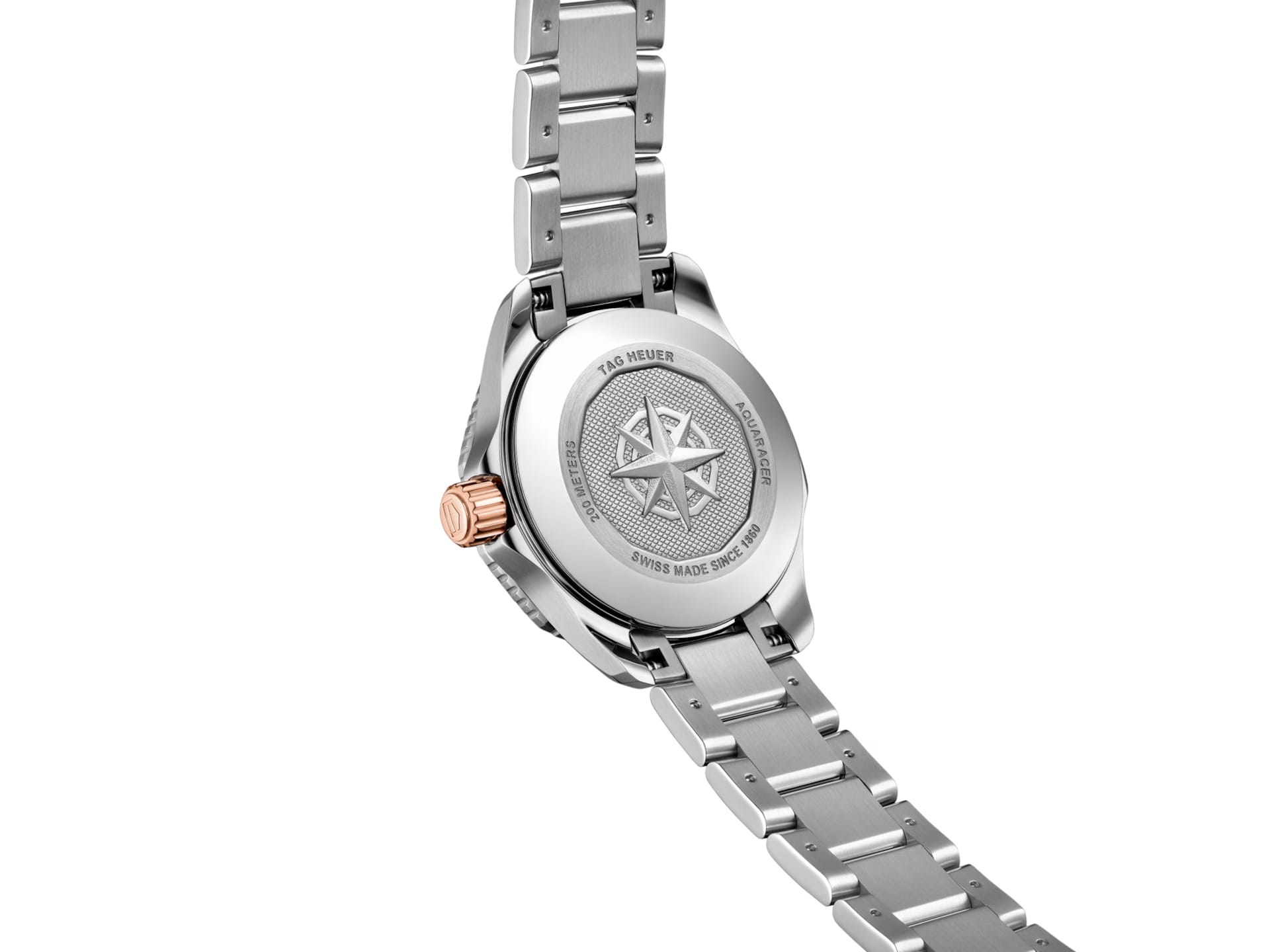 Женские швейцарские наручные кварцевые часы TAG Heuer Aquaracer Professional WBP1451.BA0622. Сапфировое стеклоСапфировое стеклоПрочный и надёжный материал из кристалла сапфира синтетического происхождения, характеризующийся особой твёрдостью и устойчивостью к царапинам и повреждениям. устойчивое к появлению царапин, обладающее высокой прозрачностью. Стрелки и метки с люминесцентным покрытиемЛюминесцентное покрытиеПозволяет считывать показания времени в темноте. Производители наносят на стрелки, часовые индексы, безель или поверхность циферблата светонакопительный состав, дающий холодное свечение.. Класс водозащиты: 200 метров, позволит плавать, нырять и заниматься другими водными видами спорта. Корпус часов изготовлен из нержавеющей стали. Браслет с раскладной застёжкойРаскладная застёжкаТакой тип застёжки используется только на браслетах из металла. Она никогда не раскрывается полностью, происходит разделение на 2 и более частей. Раскладывающая застёжка снизит вероятность потери часов к минимуму.. Вращающийся стальной безельБезельВнешний ободок, закрепляющий стекло. В спортивных часах так называется поворотное кольцо с делениями на циферблате, выполняет роль таймера – замеряет отрезки времени на шкале. Неподвижный безель – элемент декора. Однонаправленно вращающийся безель на дайверских часах позволяет фиксировать моменты погружения и выныривания на поверхность. и циферблат инкрустированы бриллиантами.