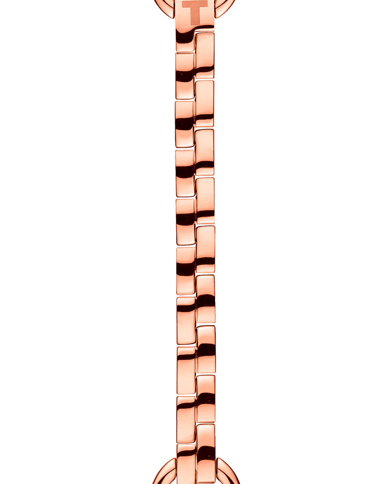Наручные часы в классическом стиле отличаются лаконичным исполнением, но отдельные детали добавляют роскоши. Модель инкрустирована 12 бриллиантами в 0,0156 карат, расположенными по окружности циферблата. Оригинальный браслет с кольцевидными звеньями и корпус имеют PVD-покрытиеPVDУльтратонкое покрытие наносится в технике вакуумного напыления, сочетает в себе нитрид титана особой прочности со слоем золота или оксида хрома. Несёт в себе декоративную или защитную функцию. оттенка розового золота. Кварцевый калибр ETA F03.111 с 3 камнями. Водостойкость 5 бар. Круглое окошко даты. Габариты: 30 x 30 x 6,35 мм.
