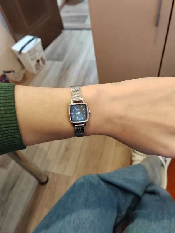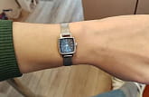 Корпус часов изготовлен из нержавеющей стали. Он очень миниатюрный 20х20 мм. На заводной головке выгравирована буква T. Механизм кварцевый. На запястье часы смотрятся женственно и изящно.