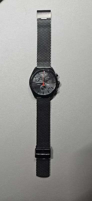 Полностью чёрное исполнение модели не влияет на качество восприятия показателей времени - метки хорошо заметны. Стрелки с люминесцентным покрытиемЛюминесцентное покрытиеПозволяет считывать показания времени в темноте. Производители наносят на стрелки, часовые индексы, безель или поверхность циферблата светонакопительный состав, дающий холодное свечение. облегчают читаемость в тёмное время суток. Модель оснащена высокоточным хронографомХронографФункция позволяет измерять отрезки времени с особой точностью: часы, минуты, секунды. Верным признаком хронографа является наличие на циферблате 3 дополнительных окошек-счётчиков., секундомером, апертурой даты. Кварцевый механизм ETA G10.211. Стекло из сапфира. Водонепроницаемость 100 метров. Браслет миланского плетения. Износоустойчивое PVD-покрытиеPVDУльтратонкое покрытие наносится в технике вакуумного напыления, сочетает в себе нитрид титана особой прочности со слоем золота или оксида хрома. Несёт в себе декоративную или защитную функцию.. Габариты: 41 x 41 x 10,7 мм.