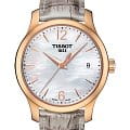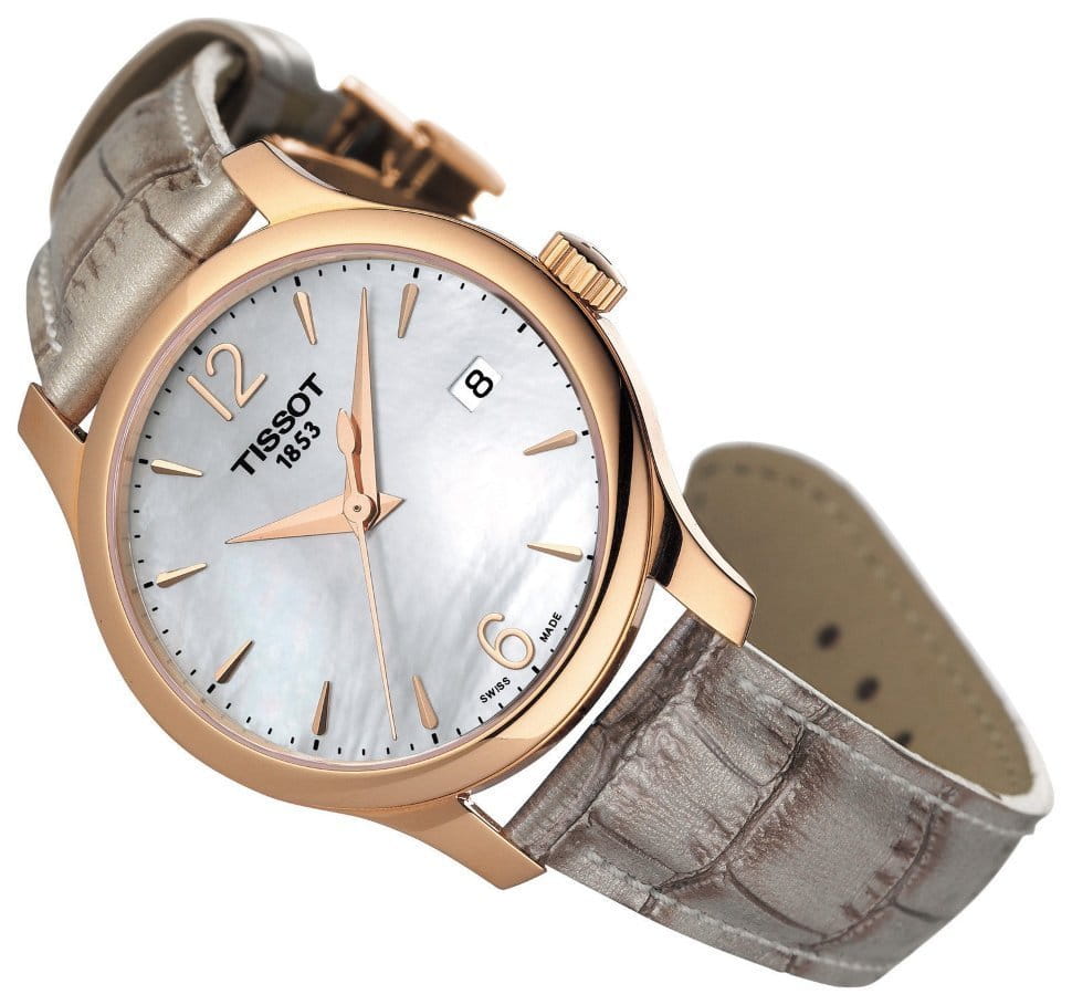 TISSOT T0632103711700 T-Classic Tradition Quartz - женские кварцевые наручные часы Корпус этих часов небольшого размера (33 мм) и выполнен из нержавеющей стали L316 с PVD-покрытием цвета розового золота Модель TISSOT T0632103711700 T-Classic Tradition Quartz имеет устойчивое к царапинам сапфировое стекло, ремешок из натуральной кожи коричневого цвета, перламутровый циферблат Калибр механизма: ETA F05111 Класс водозащиты: 30 м / 3 АТМ (защита от брызг и случайных капель) Дополнительные функции и особенности: отображение числа Полная заводская комплектация TISSOT: оригинальные часы, фирменная коробка, инструкция, сервисная книжка, роман о часовой фабрике, миникаталог, замшевый фирменный чехол черного цвета для хранения и/или переноски часов, кассовый и товарный чеки Международная гарантия 2 года Производство и сборка: Швейцария