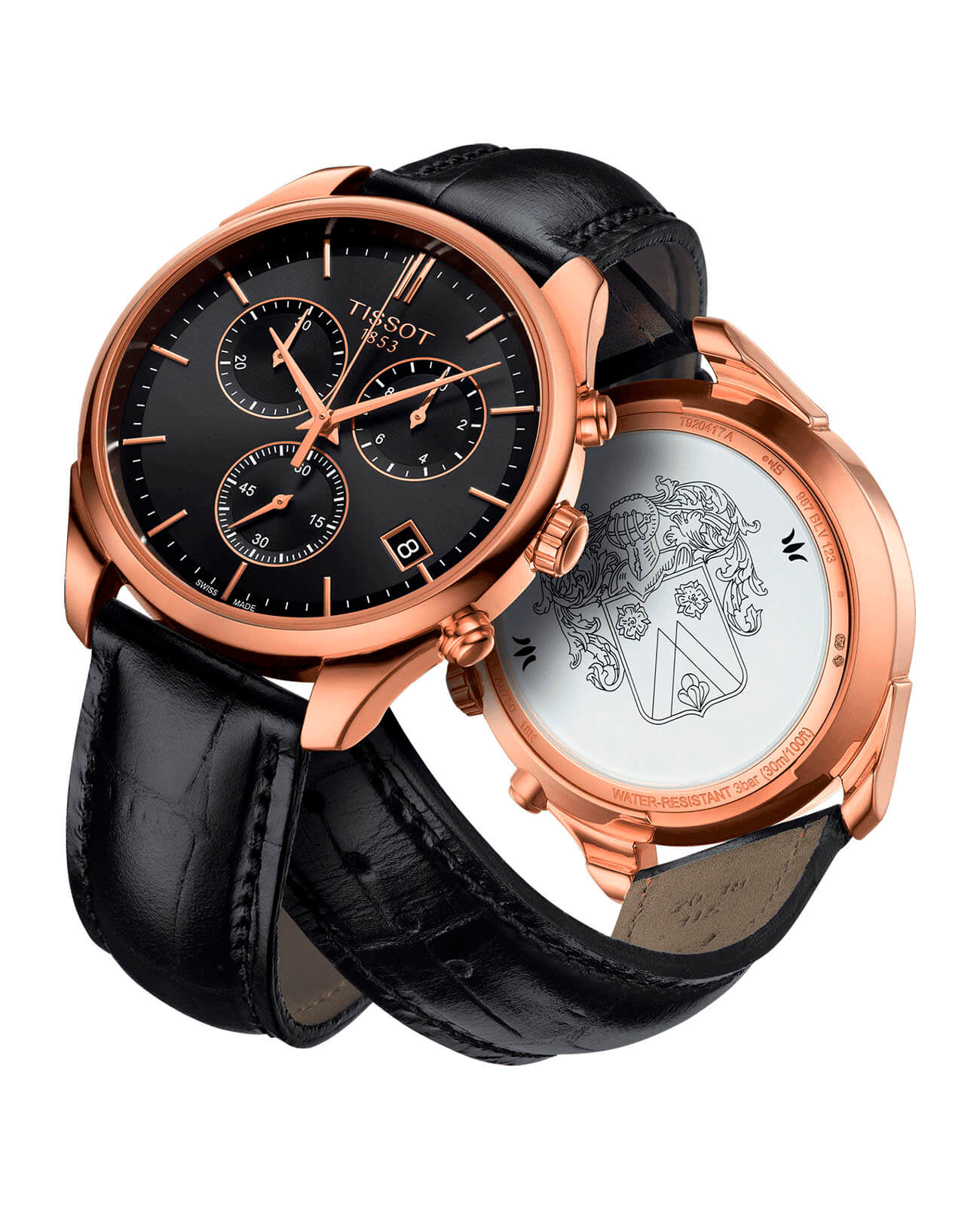 , благородный блеск которого привлекает всеобщее внимание. Кварцевый калибр ETA G10.212. Чёрный ремешок из натуральной кожи с рисунком кожи крокодила. Сапфировое стекло. Гравировка на задней крышке. Водостойкость до 30 метров.. Секундомер, отображение числа. Габариты: 41 x 41 x 9,9 мм.