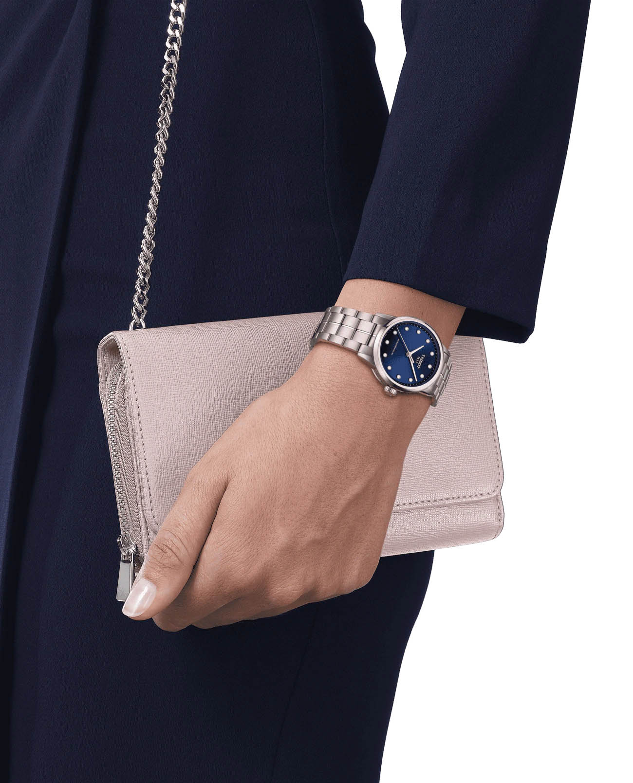 Циферблат в оригинальном исполнении привлекает взгляды окружающих синими переливами, такой оттенок красиво сочетается с серебристым блеском нержавеющей стали 316L, инкрустирован 12 бриллиантами Top Wesselton 0.0852 карат. Наручные часы с автоподзаводом имеют высокоточный калибр Powermatic 80Powermatic 80Эксклюзивный калибр от швейцарской компании ETA с увеличенным запасом хода до 80 часов за счёт удлинённой заводной пружины. Характеризуется улучшенной системой спуска со сниженным трением., с запасом хода 80 часов, его работа отлично просматривается через прозрачную заднюю крышку. Антибликовое покрытие сапфирового стекла. Водонепроницаемость при давлении 5 бар. . Индикация числа. Габариты: 33 x 33 x 9,8 мм.