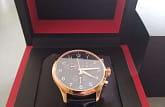 Опции хронографаХронографФункция позволяет измерять отрезки времени с особой точностью: часы, минуты, секунды. Верным признаком хронографа является наличие на циферблате 3 дополнительных окошек-счётчиков., секундомера, календаря превращают прибор для измерения времени в многофункционального помощника. Корпус увеличенного размера (45 мм) изготовлен из нержавеющей стали с золотистым PVD-покрытиемPVDУльтратонкое покрытие наносится в технике вакуумного напыления, сочетает в себе нитрид титана особой прочности со слоем золота или оксида хрома. Несёт в себе декоративную или защитную функцию., внутри находится популярный кварцевый калибр ETA G10.212. Сапфировое стеклоСапфировое стеклоПрочный и надёжный материал из кристалла сапфира синтетического происхождения, характеризующийся особой твёрдостью и устойчивостью к царапинам и повреждениям. устойчиво к появлению царапин. Водонепроницаемость 100 метров. Габариты: 45 x 45 x 11 мм.