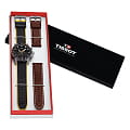 Современный хронографХронографФункция позволяет измерять отрезки времени с особой точностью: часы, минуты, секунды. Верным признаком хронографа является наличие на циферблате 3 дополнительных окошек-счётчиков. поможет подчеркнуть продуманный образ делового мужчины. Модель выполнена в спокойной тёмной расцветке. Спортивный дух выражается в коричневом ремешке из натуральной кожи с прострочкой, чёрном безелеБезельВнешний ободок, закрепляющий стекло. В спортивных часах так называется поворотное кольцо с делениями на циферблате, выполняет роль таймера – замеряет отрезки времени на шкале. Неподвижный безель – элемент декора. Однонаправленно вращающийся безель на дайверских часах позволяет фиксировать моменты погружения и выныривания на поверхность. со шкалой тахиметраТахиметрРазмеченная шкала, располагается на ободке или безеле часов. Тахиметр позволяет рассчитать скорость на определённом участке пути, расстояние измеряется в километрах или милях.. Наручные часы функционируют благодаря швейцарскому кварцевому механизму ETA G10.212. Калибр отличается максимальной точностью хода. Стекло из сапфира. Водостойкость 100 метров. Надёжный корпус из антикоррозионной стали 316L с чёрным PVD-покрытиемPVDУльтратонкое покрытие наносится в технике вакуумного напыления, сочетает в себе нитрид титана особой прочности со слоем золота или оксида хрома. Несёт в себе декоративную или защитную функцию.. Люминесцентная подсветкаЛюминесцентное покрытиеПозволяет считывать показания времени в темноте. Производители наносят на стрелки, часовые индексы, безель или поверхность циферблата светонакопительный состав, дающий холодное свечение. стрелок и индексов. Секундомер, отображение даты. Диаметр корпуса: 45,5 мм.