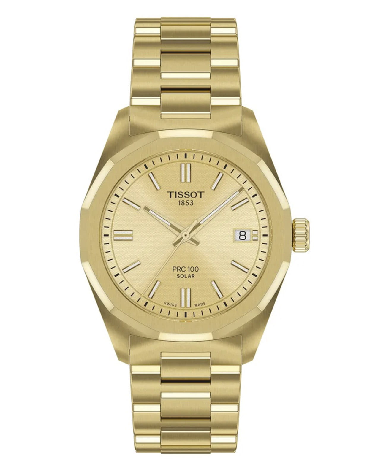 Женские кварцевые часы Tissot PRC 100 T1518223302100 — это стильный аксессуар, сочетающий в себе элегантность классики и передовые технологии. Модель выполнена в круглой форме из нержавеющей стали 316L с PVD-покрытиемPVDУльтратонкое покрытие наносится в технике вакуумного напыления, сочетает в себе нитрид титана особой прочности со слоем золота или оксида хрома. Несёт в себе декоративную или защитную функцию. цвета жёлтого золота, что придаёт ей благородный внешний вид и устойчивость к царапинам. Циферблат цвета шампань дополнен индексами, а его поверхность защищена сапфировым стекломСапфировое стеклоПрочный и надёжный материал из кристалла сапфира синтетического происхождения, характеризующийся особой твёрдостью и устойчивостью к царапинам и повреждениям., устойчивым к повреждениям. Стрелки и метки имеют люминесцентное покрытиеЛюминесцентное покрытиеПозволяет считывать показания времени в темноте. Производители наносят на стрелки, часовые индексы, безель или поверхность циферблата светонакопительный состав, дающий холодное свечение. Super-LumiNova®, обеспечивающее отличную читаемость даже в условиях слабого освещения. Часы оснащены солнечным кварцевым механизмом швейцарского производства, который обеспечивает точную работу и минимальное обслуживание. Браслет из нержавеющей стали с покрытием цвета жёлтого золота оснащён застёжкой-бабочкойЗастёжка "бабочка"Такой вид застёжки дополняется предохранителями, помогающими избежать случайного раскрытия браслета. Обладают изящным исполнением. , обеспечивающей комфорт и надёжную фиксацию на запястье. Ремешок является быстросменным, что позволяет легко менять его по желанию. Водонепроницаемость позволяет использовать модель при плавании и других водных активностях без глубокого погружения. Гарантия 3 года подтверждает качество и долговечность изделия. Эти часы станут универсальным аксессуаром для тех, кто ценит сочетание стиля, функциональности и швейцарского мастерства — идеальный выбор для повседневной носки и активного образа жизни.