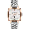 Женские наручные часы U.S. Polo Assn. Stile USPA2066-05 — это стильный и лаконичный аксессуар, выполненный в форме квадрата. Модель изготовлена из стали с PVD-покрытиемPVDУльтратонкое покрытие наносится в технике вакуумного напыления, сочетает в себе нитрид титана особой прочности со слоем золота или оксида хрома. Несёт в себе декоративную или защитную функцию., придающий благородный внешний вид и устойчивость к царапинам. Циферблат дополнен секундной стрелкой, обеспечивающей точность отсчёта времени. Защиту циферблата обеспечивает минеральное стеклоМинеральное стеклоМинеральное стекло представляет собой искусственно выращенный минерал кварца. Такое стекло отличается особой устойчивостью к повреждениям и царапинам. Уступает по некоторым качествам сапфировому стеклу., устойчивое к мелким повреждениям. Часы оснащены кварцевым механизмом, гарантирующим точность и минимальное обслуживание. Водонепроницаемость 3 АТМ позволяет использовать часы в повседневных условиях — при мытье рук или под лёгким дождём. Браслет выполнен в технике миланской сетки из стали и оснащён раскладным замкомРаскладной замокДанный вариант застежки используется только на часах с металлическим браслетом. Отличительная особенность такого крепления в том, что длина браслета становится универсальной и вы можете самостоятельно отрегулировать нужный вам размер – застежка просто двигается по браслету часов., обеспечивающей комфорт и уверенную фиксацию на запястье. Толщина корпуса составляет 10 мм, а его размер 26 мм, что делает часы компактными и удобными в носке. Эти часы станут универсальным аксессуаром для уверенных в себе женщин, которые ценят сочетание стиля, качества и эстетики — идеальный выбор для повседневного образа и торжественных случаев.