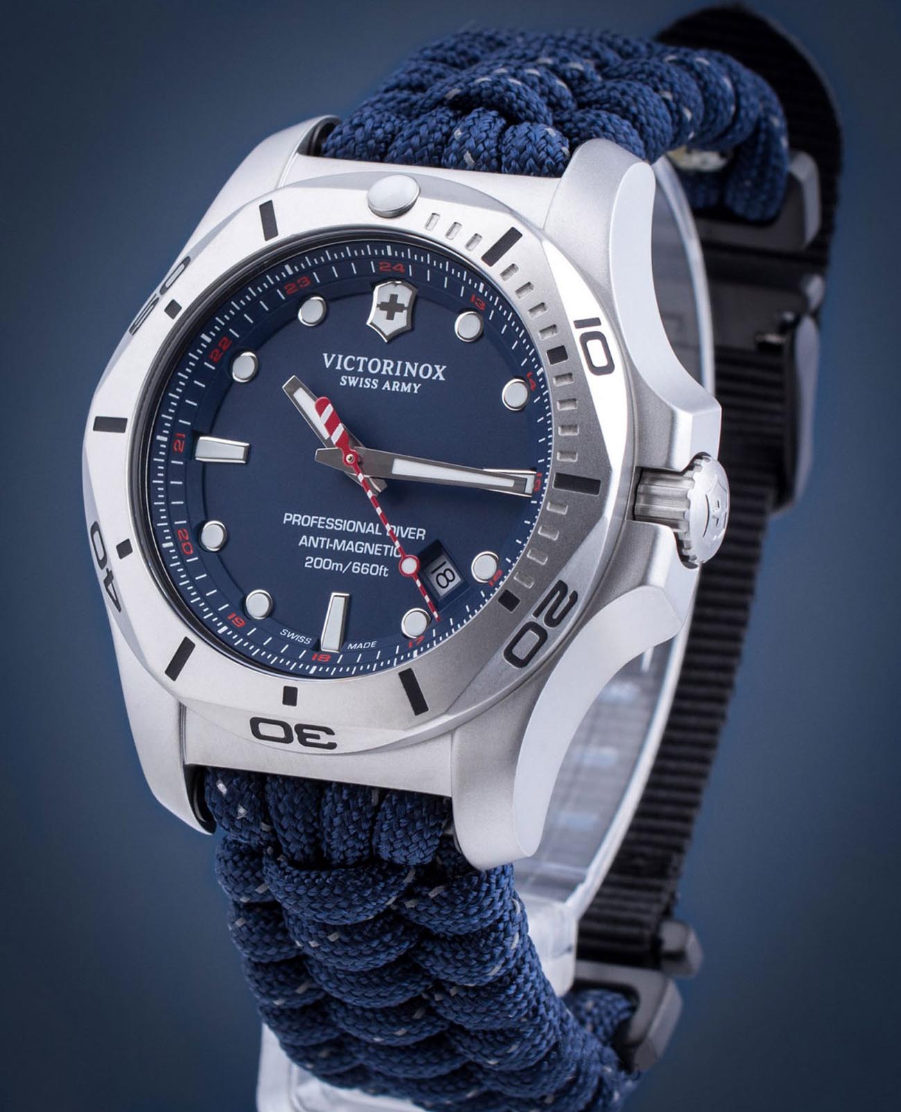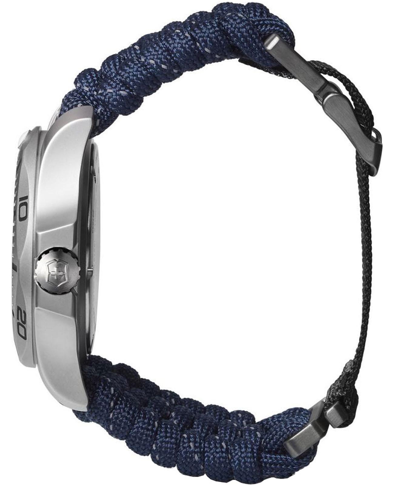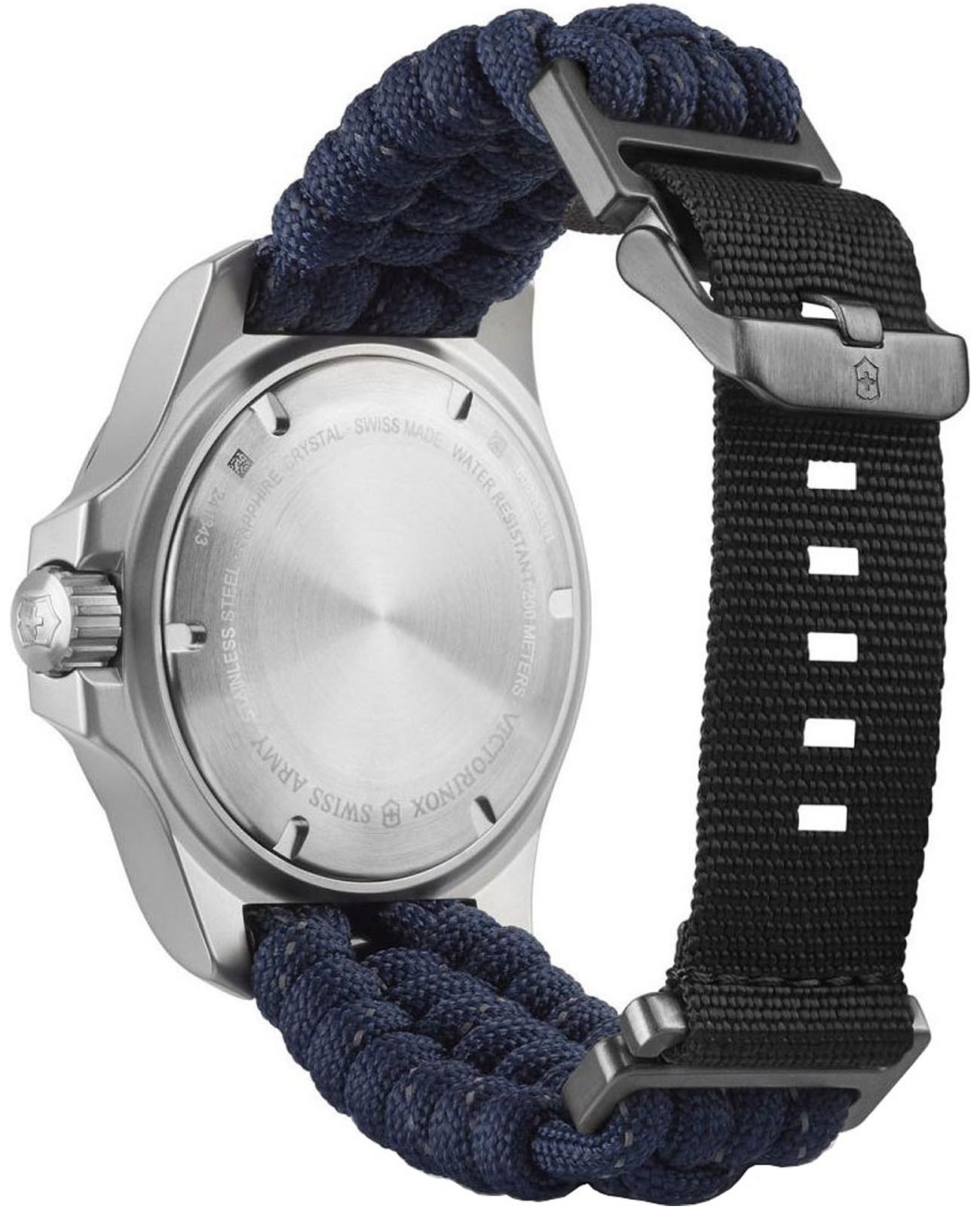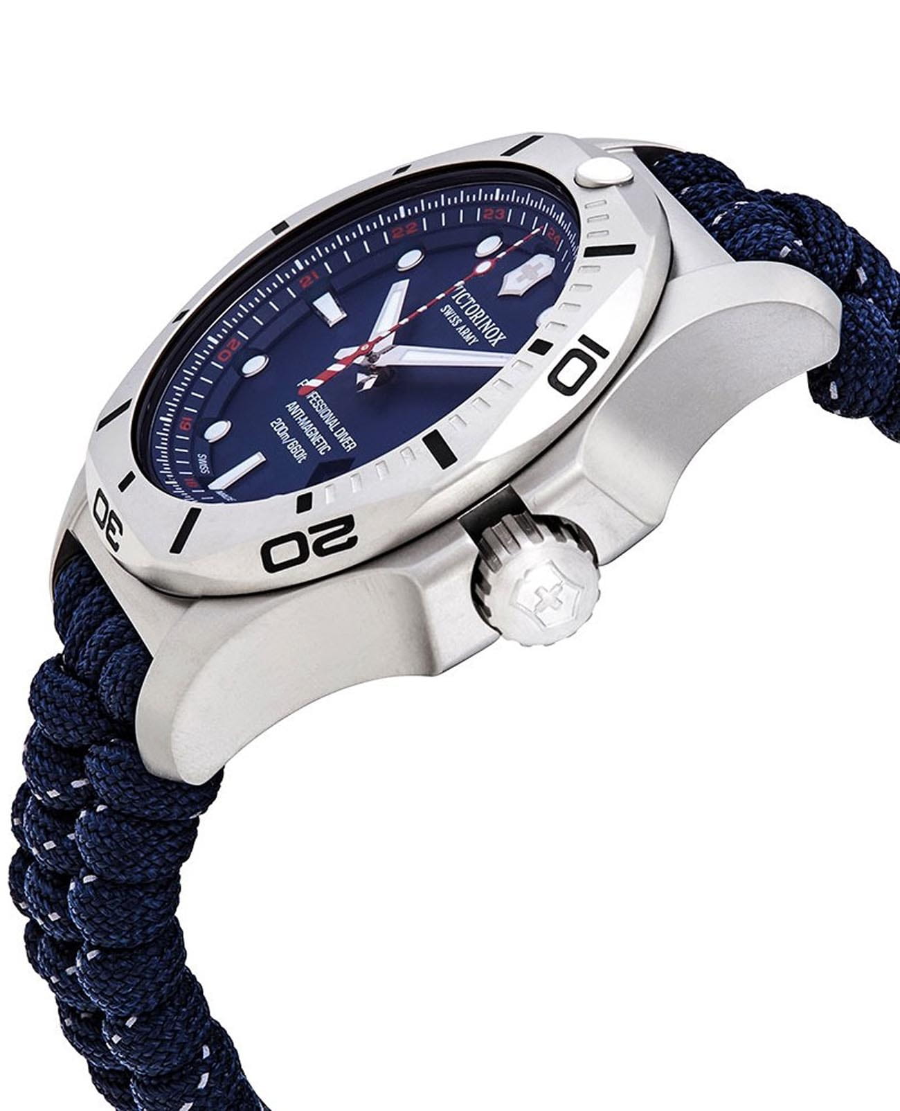 Мужские швейцарские часы Victorinox I.N.O.X. Professional Diver 241843. Сапфировое стеклоСапфировое стеклоПрочный и надёжный материал из кристалла сапфира синтетического происхождения, характеризующийся особой твёрдостью и устойчивостью к царапинам и повреждениям. с трёхслойным антибликовым покрытием. Корпус часов выполнен из карбона. Ремешок изготовлен из плетенной паракордовой стропы, длиной 2,5 метра и способной выдержать 250 кг. Влагозащита: 200 метров, позволит плавать, нырять и заниматься другими водными видами спорта. Окошко даты находится в положении между 4 и 5 часов. Стрелки и метки с люминесцентным покрытиемЛюминесцентное покрытиеПозволяет считывать показания времени в темноте. Производители наносят на стрелки, часовые индексы, безель или поверхность циферблата светонакопительный состав, дающий холодное свечение.. В комплекте съемный защитный бампер с увеличительным стеклом и резиновый ремешок.