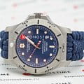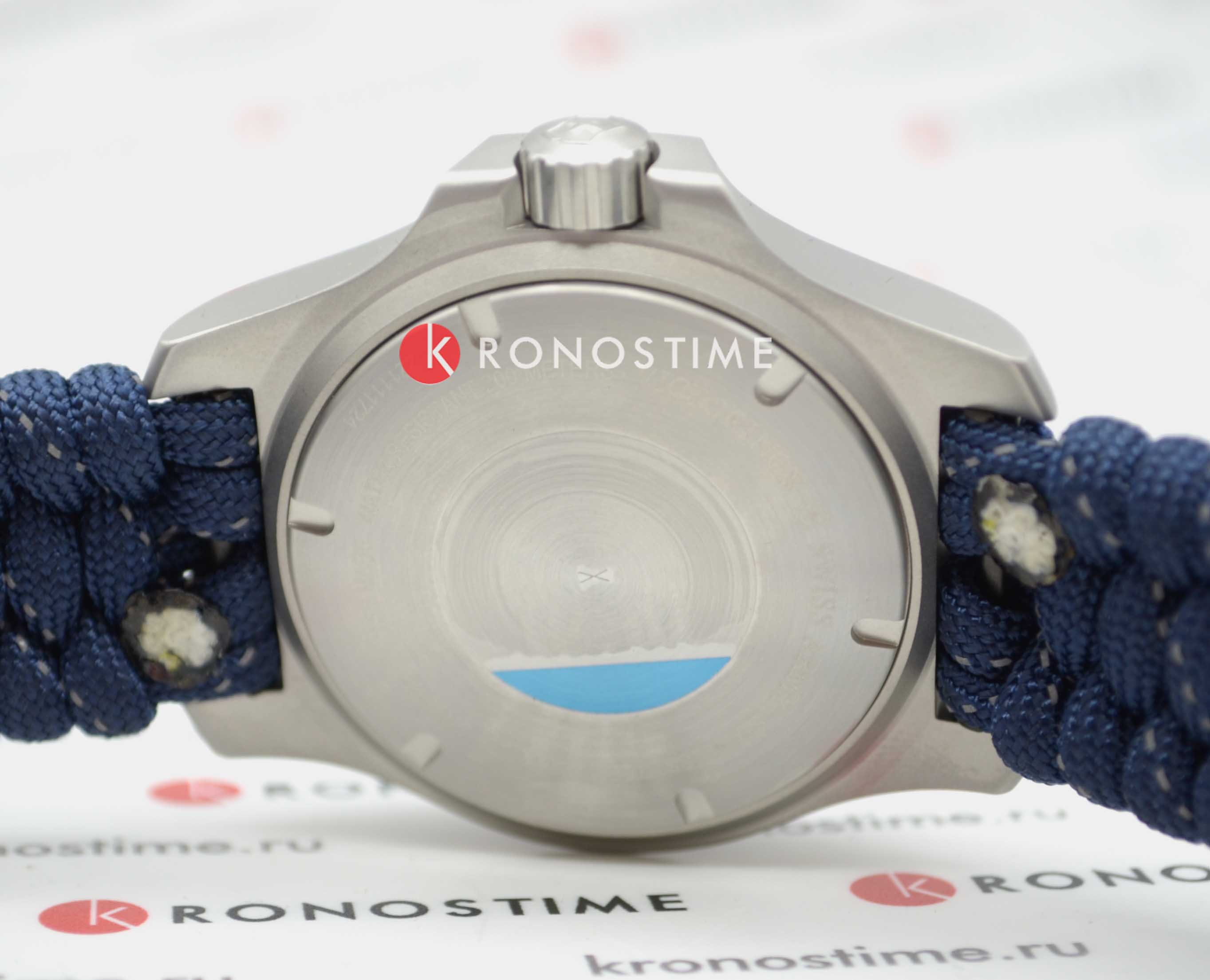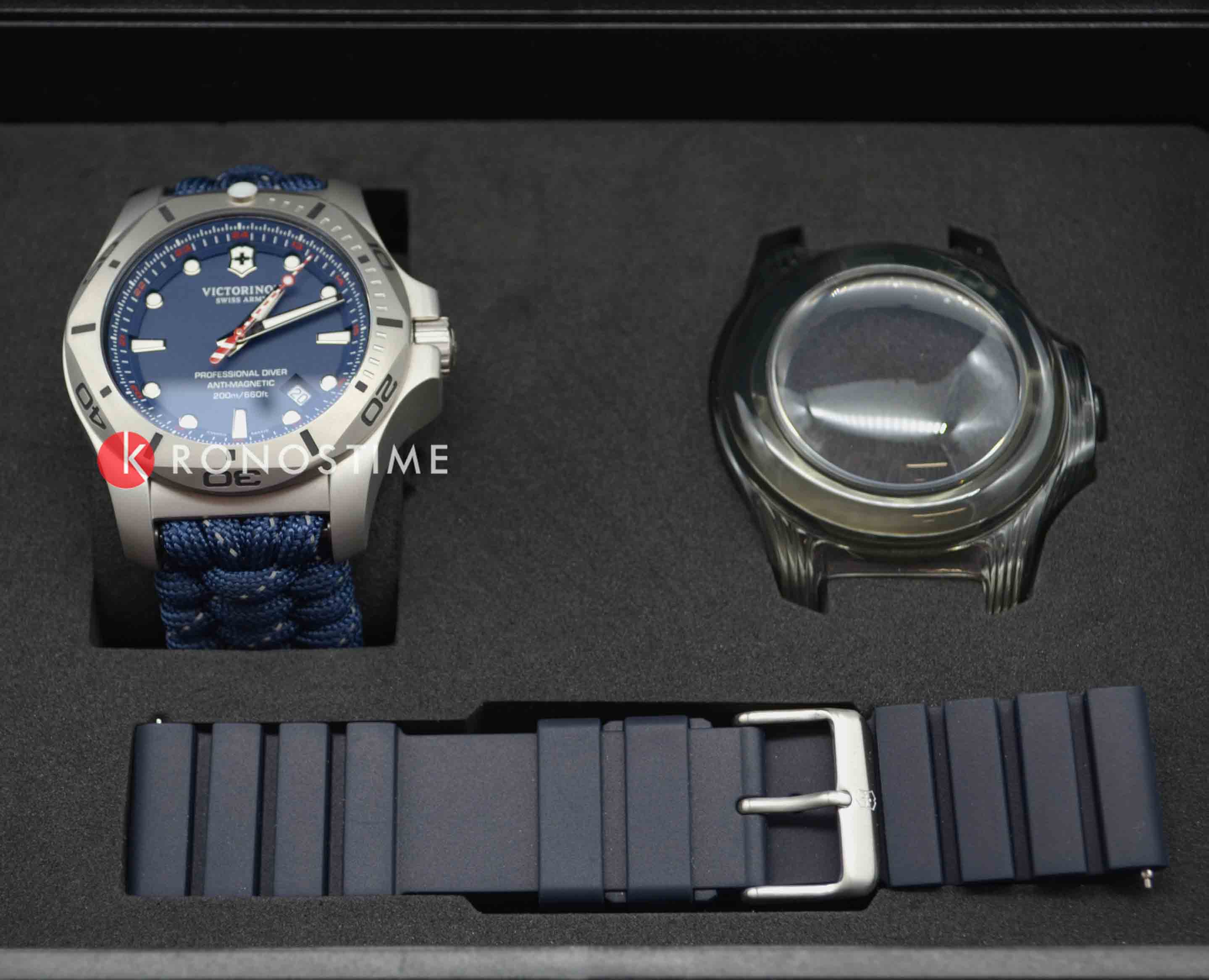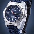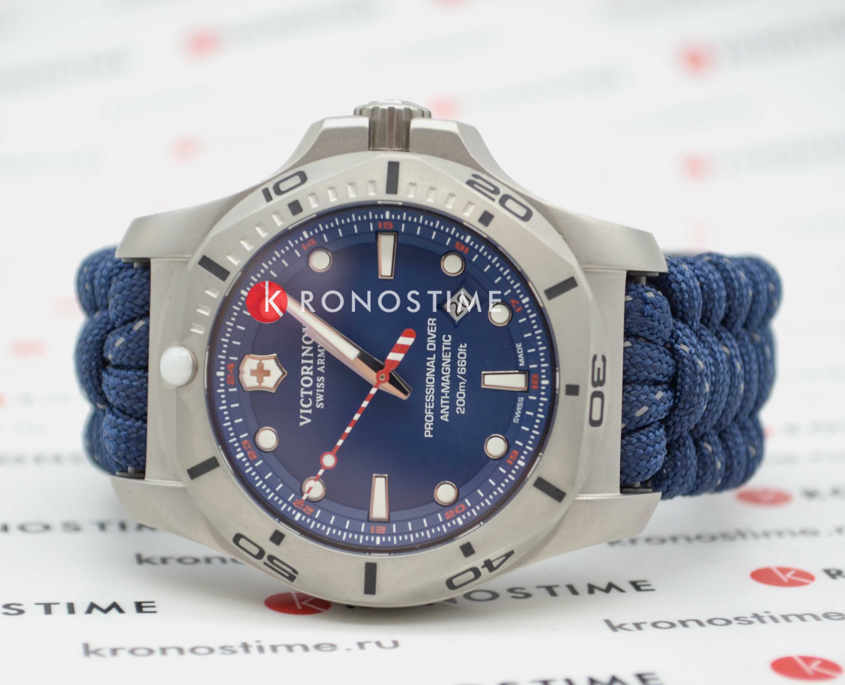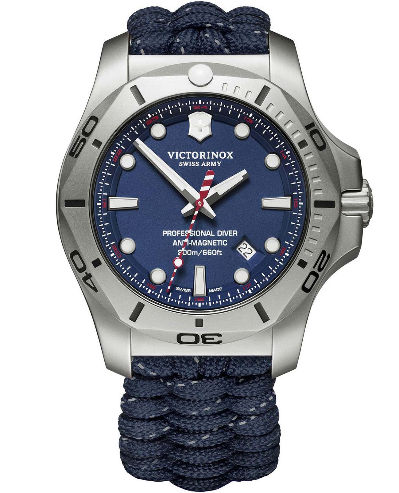 Мужские швейцарские часы Victorinox I.N.O.X. Professional Diver 241843. Сапфировое стеклоСапфировое стеклоПрочный и надёжный материал из кристалла сапфира синтетического происхождения, характеризующийся особой твёрдостью и устойчивостью к царапинам и повреждениям. с трёхслойным антибликовым покрытием. Корпус часов выполнен из карбона. Ремешок изготовлен из плетенной паракордовой стропы, длиной 2,5 метра и способной выдержать 250 кг. Влагозащита: 200 метров, позволит плавать, нырять и заниматься другими водными видами спорта. Окошко даты находится в положении между 4 и 5 часов. Стрелки и метки с люминесцентным покрытиемЛюминесцентное покрытиеПозволяет считывать показания времени в темноте. Производители наносят на стрелки, часовые индексы, безель или поверхность циферблата светонакопительный состав, дающий холодное свечение.. В комплекте съемный защитный бампер с увеличительным стеклом и резиновый ремешок.