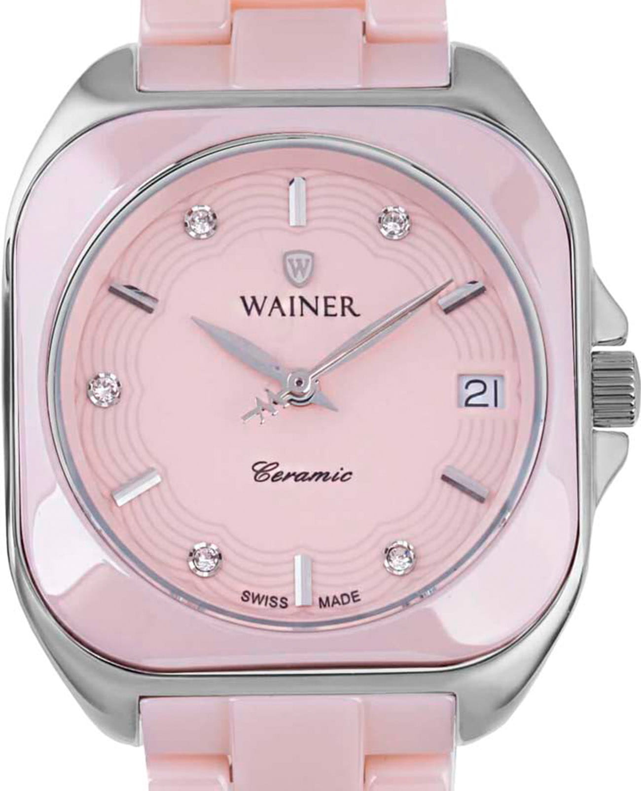 Женские кварцевые часы Wainer Ceramic WA.18070-B — это элегантный аксессуар, воплощающий швейцарское качество и изысканный дизайн. Модель выполнена в квадратной форме из стали с CeramosCeramosМатериал являет собой инновационное сочетание высокотехнологичной керамики и сплава металла. Он объединяет керамическую устойчивость к царапинам и металлический роскошный блеск. , что придаёт ей прочность и устойчивость к царапинам. Циферблат розового цвета гильоширован в зоне меток и дополнен логотипом бренда, а его поверхность украшена штриховыми и точечными элементами с Люминесцентное покрытиеЛюминесцентное покрытиеПозволяет считывать показания времени в темноте. Производители наносят на стрелки, часовые индексы, безель или поверхность циферблата светонакопительный состав, дающий холодное свечение. и фианитами, что делает его привлекательным и выразительным. Секундная стрелка на конце декорирована буквой W, а рифлёная заводная головка с защитой оснащена фирменным логотипом, подчёркивая внимание к деталям. Защиту циферблата обеспечивает Сапфировое стеклоСапфировое стеклоПрочный и надёжный материал из кристалла сапфира синтетического происхождения, характеризующийся особой твёрдостью и устойчивостью к царапинам и повреждениям., устойчивое к повреждениям и обеспечивающее чёткую видимость показаний при любом освещении. Керамический браслет шириной 16 мм гармонично сочетается с корпусом и добавляет модели изысканности. Часы водонепроницаемы до 30 метров , что позволяет использовать их при мытье рук или под лёгким дождём. Механизм калибра Ronda 705 гарантирует точность хода и надёжность. Эти часы станут универсальным аксессуаром для тех, кто ценит сочетание стиля, функциональности и швейцарского мастерства — идеальный выбор для повседневной носки и торжественных случаев.