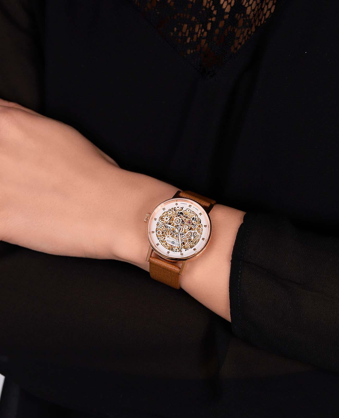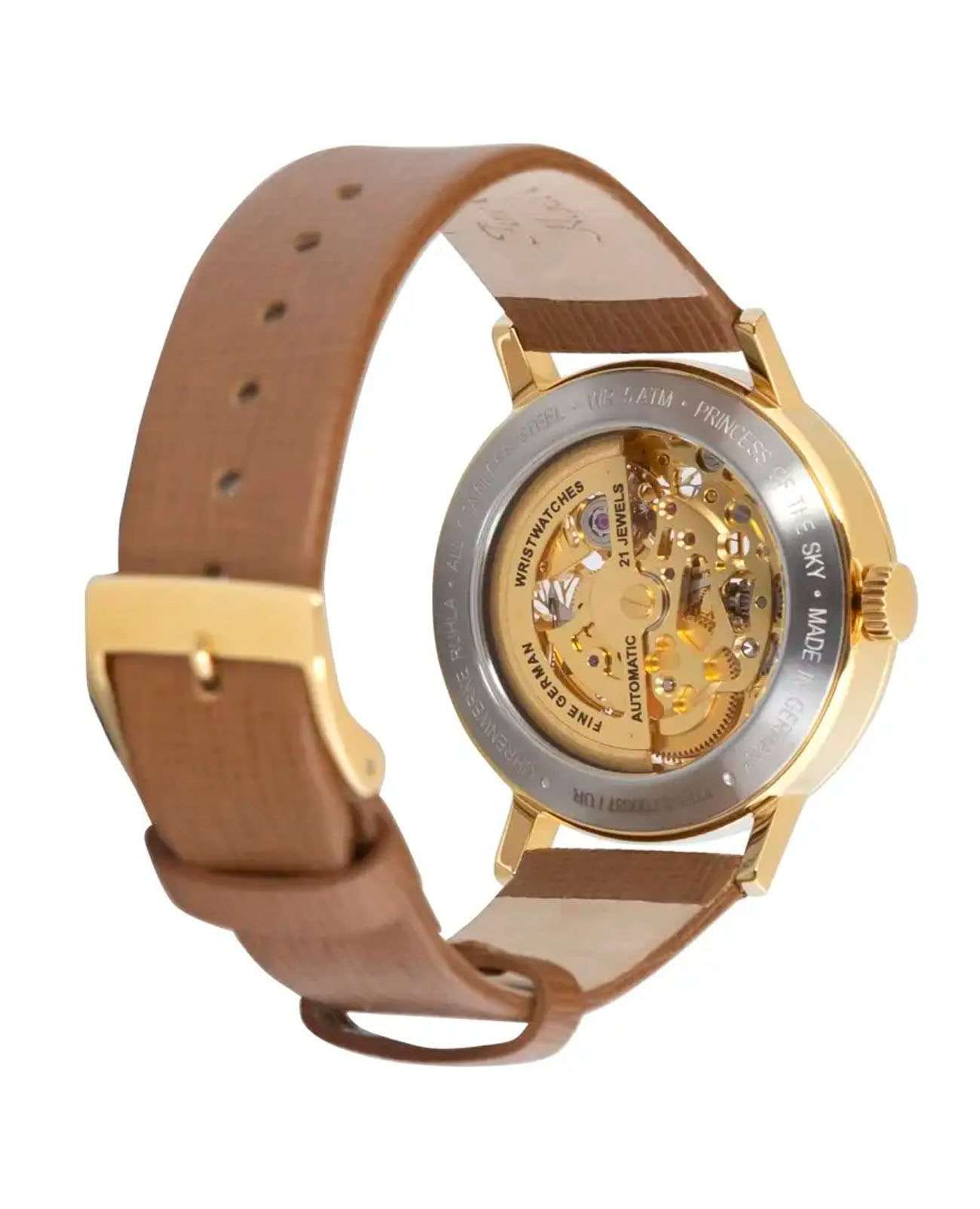 Женские наручные часы Zeppelin Princess of the Sky 7463-5 сочетают в себе элегантный дизайн и точность автоматического механизма. Модель обладает круглым корпусом диаметром 36 мм, изготовленным из нержавеющей стали с PVD-покрытиемPVDУльтратонкое покрытие наносится в технике вакуумного напыления, сочетает в себе нитрид титана особой прочности со слоем золота или оксида хрома. Несёт в себе декоративную или защитную функцию. и с кристаллической задней крышкой для глубокой демонстрации работы механизма. Браслет выполнен из высококачественной кожи, обеспечивающей комфортное ношение и стильный внешний вид. Циферблат скелетонирован, открывая вид на золотое скелетное движение, украшенное 12 кристаллами Swarovski, что добавляет особую роскошь и изящество. Для защиты используется минеральное стеклоМинеральное стеклоМинеральное стекло представляет собой искусственно выращенный минерал кварца. Такое стекло отличается особой устойчивостью к повреждениям и царапинам. Уступает по некоторым качествам сапфировому стеклу. с антибликовое покрытиеАнтибликовое покрытиеСлой оксида металла в 0,13-0,3 микрон, благодаря которому стекло часов не бликует и не отражает свет. Антибликовое покрытие уменьшает отражение света в 10 раз, обеспечивая отличную читаемость показателей циферблата., обеспечивающее прочную защиту от царапин и оптимальную видимость циферблата. Часы работают на автоматическом механизме, который заряжается за счет естественного движения руки пользователя, делая их автономными в использовании. Водонепроницаемость часов составляет 5 атмосфер (50 метров), что позволяет использовать их в повседневных условиях, однако не рекомендуется для плавания или дайвинга. Эта модель станет прекрасным дополнением как к повседневному, так и к вечернему образу благодаря своей элегантности и шарму.